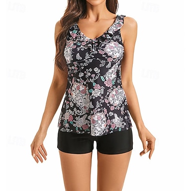 Mulheres Maiô com estampa floral Roupa de banho Tankini Floral Ultra Leve (UL) Elástico Sem Manga Roupa de Banho Surfe Snorkeling Verão