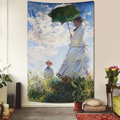 Tapeçaria de parede em estilo impressionista de Monet, com mulher de vestido branco segurando um guarda-chuva verde, prado com céu azul, para sala de estar, quarto, decoração de casa ou presente para
