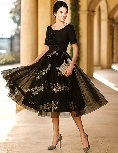 Linha A Longuette Vestido de festa Vestido Coquetel Vestido Flare Manga Curta Gola Redonda Scoop pescoço Elegante Luxuoso Formal Poliéster Vestido Para Mãe dos Noivos com Apliques