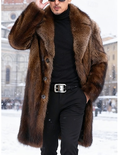 Homens Jaqueta de Inverno Casaco de pele falsa Férias Diário Térmico / Quente Tosão Outono Inverno Tecido Moda Roupa de rua Lapela Longo Preto Marron Casaco