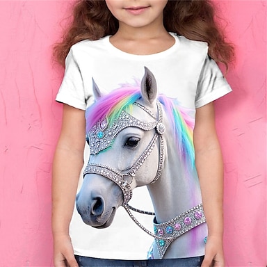 Para Meninas 3D Cavalo Camisa Camiseta Manga Curta Verão Primavera Moda Básico Infantil 4-12 anos Gola Redonda Ao ar livre Casual Diário Normal