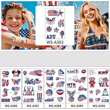 10 folhas de adesivos de tatuagem prateados para o Dia da Independência, à prova d'água e resistentes ao suor, para uso facial em festas e festivais internacionais.