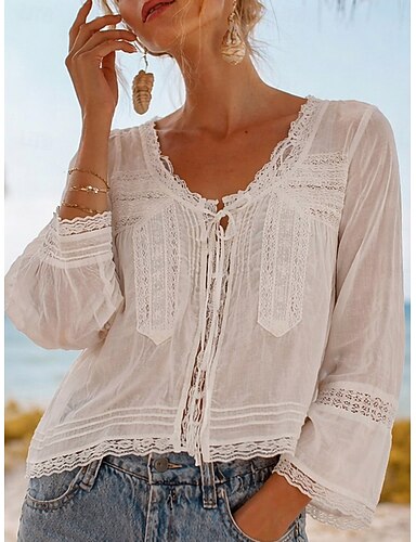 Mulheres Blusa Renda Côr Sólida Boêmia Vintage Casual Manga Longa Decote V Tops curtos Diário Branco Verão Primavera Outono