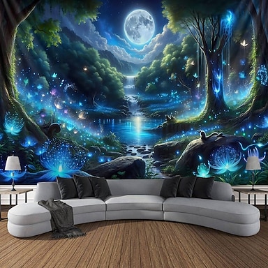 Tapeçaria de parede com floresta bioluminescente mística, lua cheia e cachoeira, em um jardim mágico encantado sob a luz do luar azul, com flores brilhantes, ideal para decoração de sala de jogos,