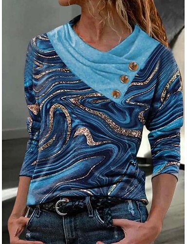 Mulheres Camiseta Botões Imprimir Geométrica Abstrato Diário Básico Manga Longa Pescoço de Pilha Decote V Tops regulares Casual Final de semana Azul Vermelho Azul Marinha Azul Céu Verde Outono