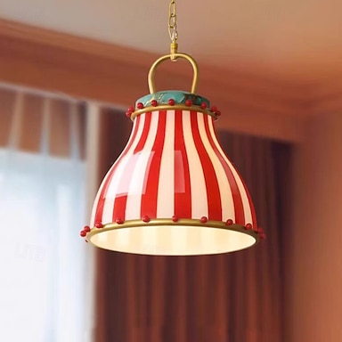 Lustre vintage com design listrado em vermelho e branco e cúpula de vidro para decoração de casa, luminária de ambiente e iluminação de destaque.