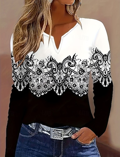 Mulheres Camiseta Zíper Imprimir Gráfico Vintage Boêmia Tropical Havaiana Manga Longa Decote V Tops regulares Diário Para Noite Final de semana Branco e Preto Verão Primavera Outono Inverno