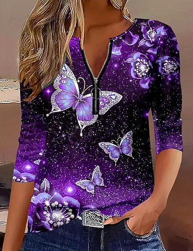 Mulheres Camiseta Zíper Imprimir Âmbar Gráfico Animal Elegante Vintage à moda Manga Longa Decote Redondo Pescoço Entalhado Tops regulares Diário Final de semana Roxo Primavera Outono Inverno