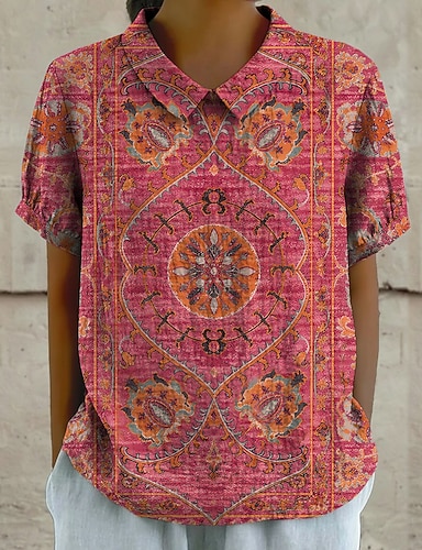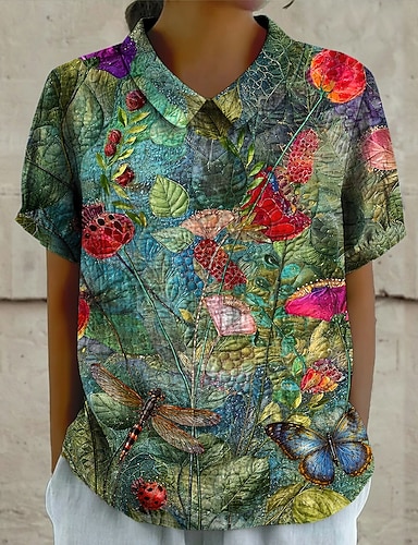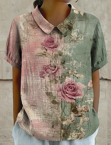 Blusa feminina com botões, estampa floral, estilo vintage, para férias, uso diário, manga curta, tecido texturizado, gola de camisa, modelo clássico, ideal para ocasiões informais, passeios, na cor