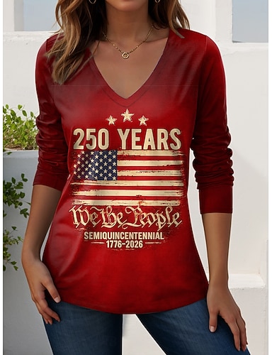 Dia da Independência Americano 250º Aniversário Camiseta Feminina Patriótica Gráficos Estampados Bandeira Americana Vintage Estilo Casual Manga Longa Decote em V Tops Regulares Uso Diário Fim de