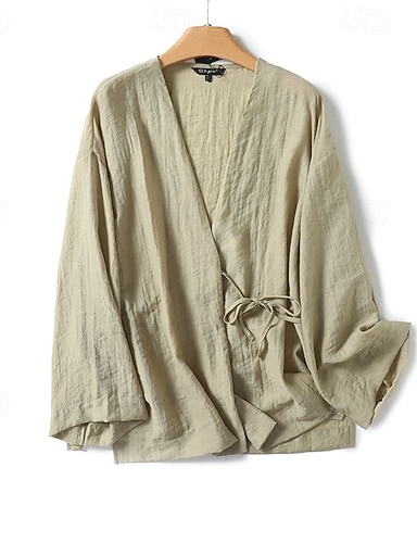 Mulheres Camisas de algodão e linho Blusa gravata na frente Tecido Elegante Vintage à moda Manga Longa Decote V Tops regulares Diário Feriado Para Noite Verde Verão Primavera