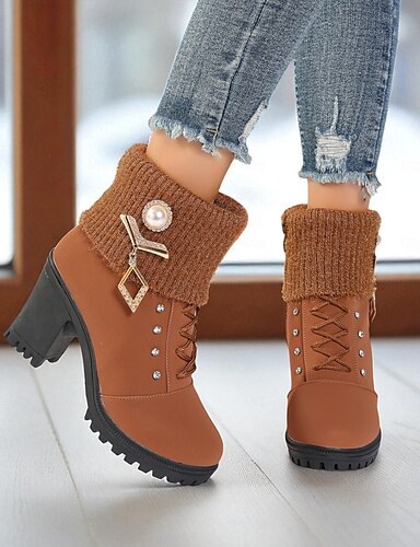 Botas femininas marrons de cano curto com forro de lã – botas de inverno quentes em couro sintético com salto, ideais para clima frio, para o trabalho e looks casuais.