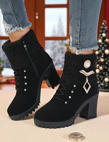 Botas pretas de cano curto com salto plataforma para mulheres – botinhas chiques de salto alto com forro de lã, zíper lateral e detalhe decorativo de pérola sintética, calçado versátil para outono, inverno e ocasiões formais.
