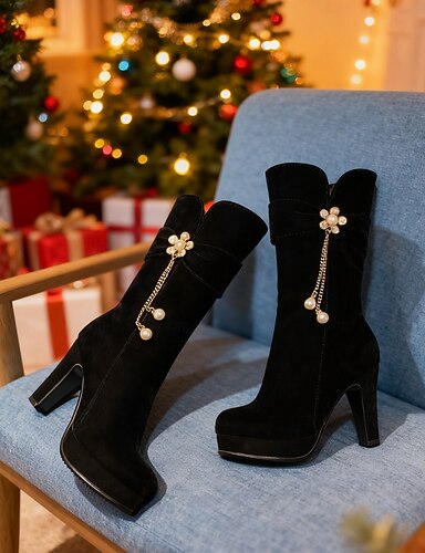 Botas femininas pretas de cano alto – botas de inverno de couro sintético com acabamento em pele sintética, laço e pingente de pérola para o Natal, festas e uso ao ar livre