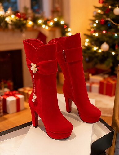 Botas femininas de camurça vermelha com fecho de zíper e salto grosso, confortáveis e estilosas, perfeitas para o Natal, passeios de inverno e eventos diários