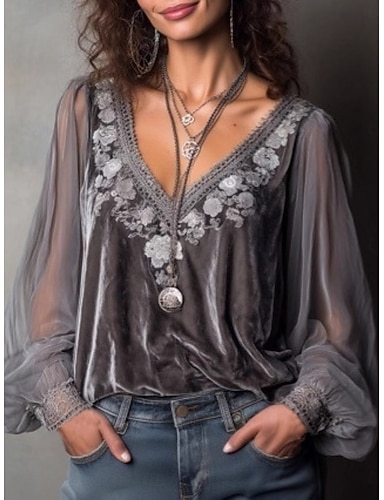 Mulheres Camisa Social Veludo Blusa Bordado Floral Gráfico Tecido Vintage à moda Clássico Manga Longa Decote V Tops regulares Tops longos Diário Feriado Para Noite Cinzento Verão Primavera Outono