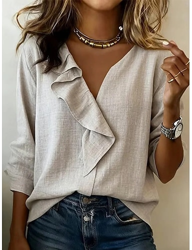 Mulheres Blusa Linho de algodão sintético Frufru Côr Sólida à moda Casual Manga 3/4 Decote V Tops regulares Diário Preto Branco Rosa Vermelho Verde Primavera Outono