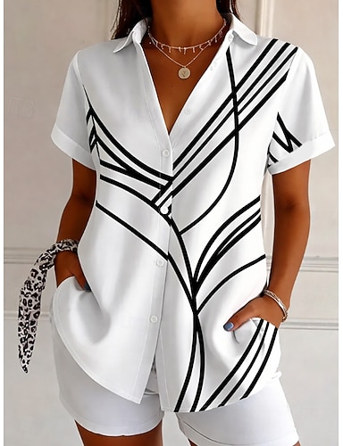 Mulheres Camisa Social Gráfico Geométrica Vintage Diário à moda Manga Curta Colarinho de Camisa Tops regulares Diário Preto e Branco Preto Branco Amarelo Rosa Verão Primavera