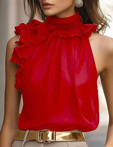 Mulheres Tops de verão Blusa Tops elegantes Franzido Frufru Patchwork Côr Sólida Tecido Elegante Vintage Estilo bonito Sem Manga Halter pescoço Tops regulares Diário Trabalho Feriado Preto Vermelho