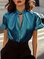 Mulheres Elegant Top de cetim Tops de verão Blusa Franzido Patchwork Botões Côr Sólida Tecido Elegante Vintage senhoras Manga Curta Colarinho de Camisa Tops regulares Diário Trabalho Para Noite Azul