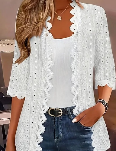 Mulheres Camisa de renda Blusa Tops elegantes Guarnição do laço Tecido Elegante senhoras à moda Meia Manga Tops regulares Diário Trabalho Feriado Branco Verão Primavera