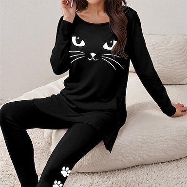 Mulheres Pijamas Simples Gato Casa Manga Curta Gola Redonda Preto Branco Vermelho Roxo Verão Primavera Outono