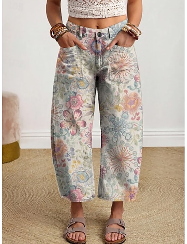 Mulheres Perna larga chinês Calças Calças Cropped Férias Vintage Básico Mimolet Cintura Alta Floral Gráfico Cintura elástica Imprimir Confortável Conforto Respirabilidade Sem Elasticidade Diário Ao