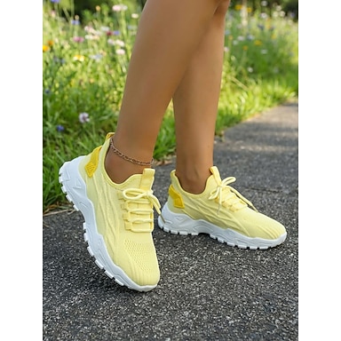 Tênis feminino amarelo de tricô – tênis esportivo leve e respirável, ideal para caminhadas, academia, viagens e uso diário.