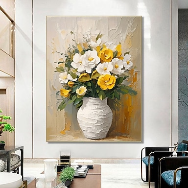 Pintura a óleo original pintada à mão com flores brancas e amarelas, pintura floral texturizada de grandes dimensões, arte de parede vertical personalizada, decoração moderna para sala de jantar.
