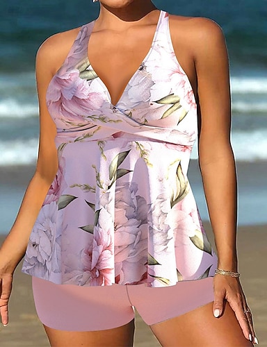 Mulheres Roupa de Banho Tankini 2 partes Slip roupa de banho Frente Única Férias Roupa de Praia Âmbar Floral Decote U Sem Manga Fatos de banho