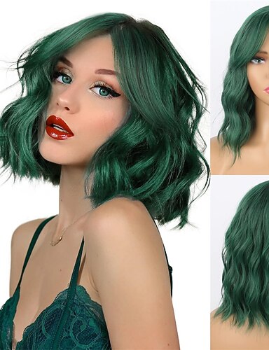 Perucas Verdes Peruca Bob Ondulada Verde Escura com Franjas de Cortina Sintética Curta para Mulheres (Verde)