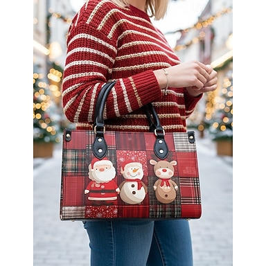 Bolsa de Natal feminina em couro sintético com estampa de Papai Noel e boneco de neve, ideal para presentear no Natal e para as festas de fim de ano. Perfeita para festas e passeios de inverno.