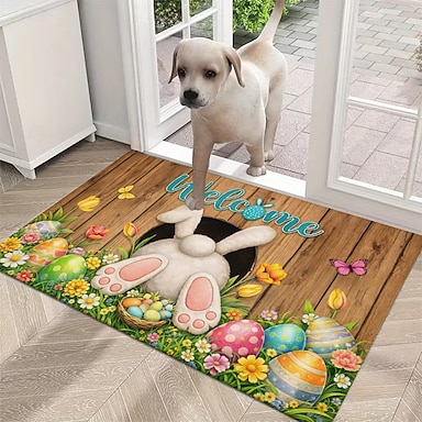 Tapete de Páscoa com ilusão de ótica 3D de bumbum de coelho e placa de boas-vindas, estampa plana 2D com design festivo de ovo e flor, perfeito para entrada.