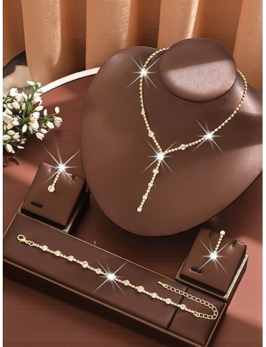 Conjunto de joias femininas douradas com strass - elegante colar em formato de Y e brincos pendentes. &Pulseira com cristais brilhantes, acessórios perfeitos para bailes de formatura e festas.