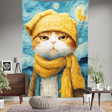 Tapeçaria de parede divertida, paródia de Van Gogh, com um gato usando chapéu e cachecol amarelos, no estilo da pintura "Noite Estrelada", perfeita para decorar sala de estar, quarto ou dormitório. Um presente ideal para amantes de gatos.