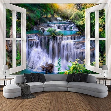 Tapeçaria de parede 3D com vista para a natureza, paisagem de floresta com cachoeira em cascata, arte serena da selva, cenário estético para sala de estar e quarto.
