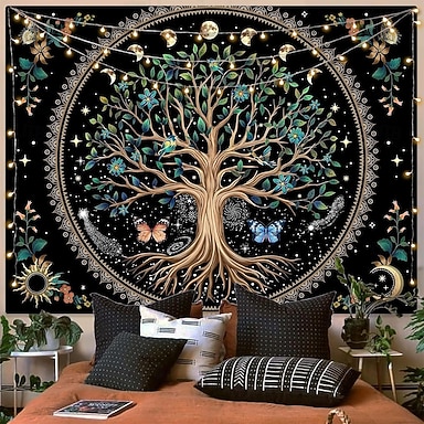 Tapeçaria de parede com árvore da vida celestial, fases da lua, borboleta, mandala do sol e da lua, decoração estética para quarto, sala de estar, painel de fundo para ambientes internos.