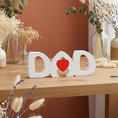 Item decorativo moderno e minimalista em formato de coração branco e vermelho com a palavra "Pai" para o Dia dos Pais. Ideal para decorar mesas e ambientes internos, perfeito para enfeitar a decoração e a decoração da ocasião.