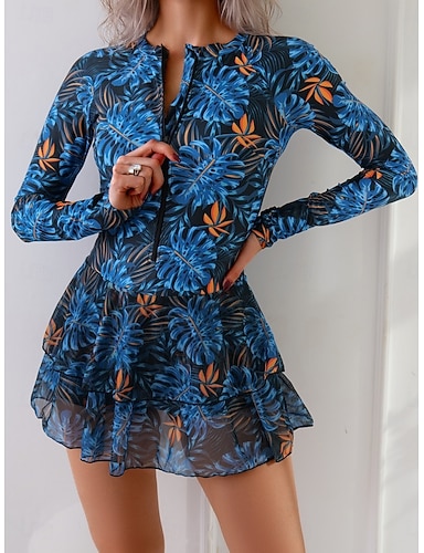 Maiô Feminino de Uma Peça Slimming com Saia Boho Monokini Saia Controle de Barriga Cintura Alta Slim Costas Descobertas Roupas de Praia de Férias Gráfico Bloco de Cores Decote Redondo Mangas Longas