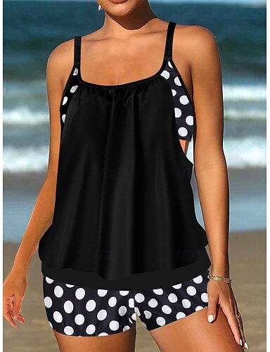 Maiô Tankini Feminino 2 Peças Short Controle de Barriga Cintura Alta Slim Costas Descobertas Roupas de Praia de Férias Poá Decote em U Sem Mangas