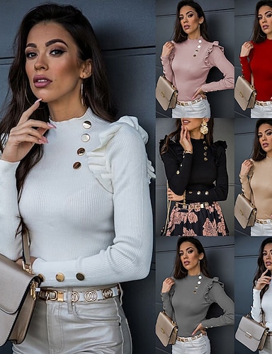 blusa feminina básica diária malha manga longa regular tops gola alta gola alta casual preto branco rosa azul marinho bege outono& inverno
