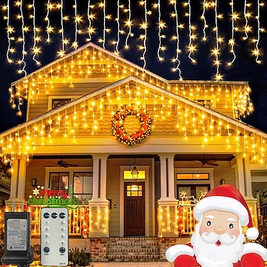 Luzes de Natal em forma de pingente de gelo, 10 metros (33 pés), 400 LEDs, 48 pingentes, 8 funções, timer, controle remoto, fio transparente, luzes decorativas para festas de casamento e outras ocasiões, baixa voltagem, seguras para uso com plugue.