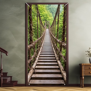 Capa de porta com ilusão de ótica 3D inspirada em ponte suspensa, impressão plana 2D para adicionar um toque aventureiro a qualquer ambiente.