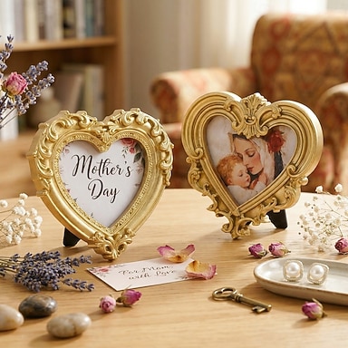 Porta-retratos de mesa vintage dourado em resina, em formato de coração, pintado à mão, para o Dia das Mães. Ideal para decoração de casa e festas. &adereço para festivais, presentes para mães,