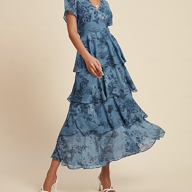 Linha A Longuette Vestido de festa Vestido Coquetel Vestido de convidada de casamento Vestido Para Mãe dos Noivos Meia Manga Decote V Elegante Formal Kentucky Derby Cetim com Estampa floral