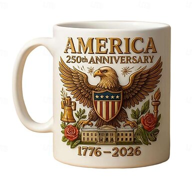 Moeda comemorativa do 250º aniversário dos EUA com desenhos do sino da liberdade e da águia, em homenagem aos 250 anos de liberdade americana.