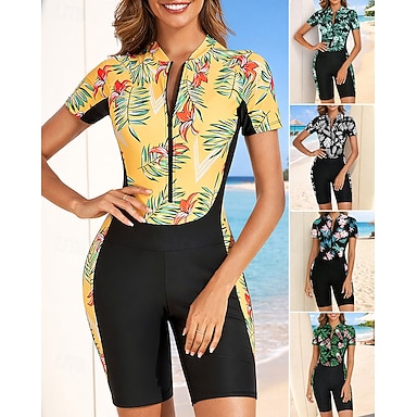 Mulheres Anti Atrito Roupa de banho Maiôs Tropical Perna até o meio da coxa Proteção UV Secagem Rápida Elástico Manga Curta Roupa de Banho roupa de banho Surfe Praia Natação Verão