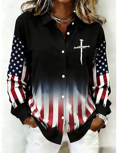 Dia da Independência Americana Mulheres Camisa Social Botões Imprimir Gráfico Abstrato 250º aniversário dos Estados Unidos Vintage à moda Moderno Manga Longa Colarinho de Camisa Tops longos Diário
