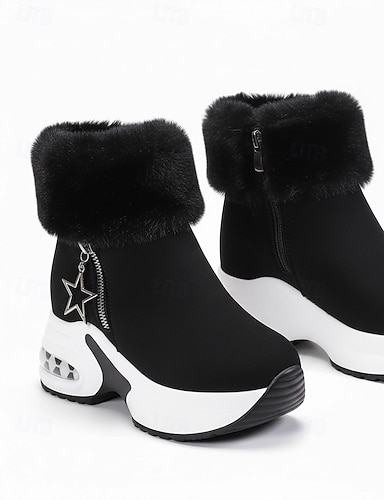 Botas pretas femininas de cano curto com punhos de pele sintética e salto plataforma – estilo chique de inverno, perfeitas para o clima frio, passeios casuais e eventos de fim de ano.