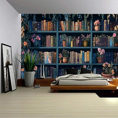 Tapeçaria digital moderna com estampa de paisagem e estante de livros para decoração de parede, ideal para quarto, sala de estar, dormitório ou qualquer outro ambiente. Fundo fotográfico perfeito para